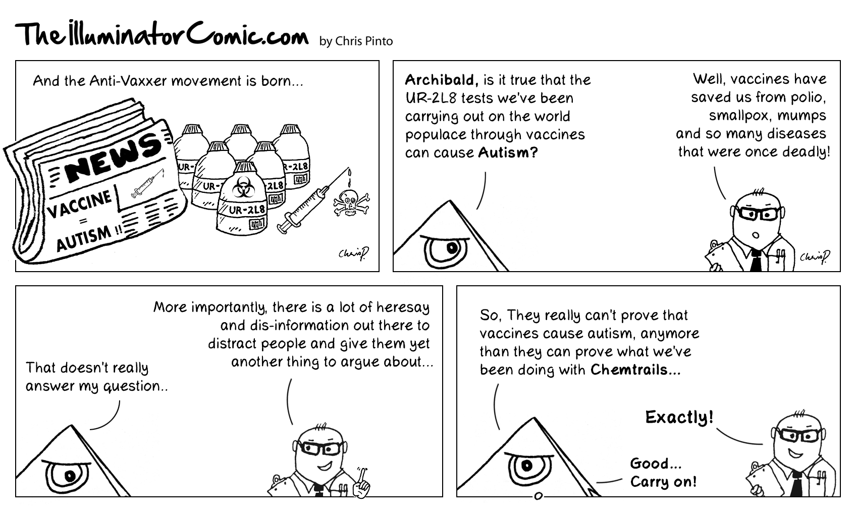 Illuminati, The Illuminator Comic, Triangle-head, Conspiracy theory, New World Order, NWO, Chemtrails, UR2L8, autism, vaccine, antivaxxers,