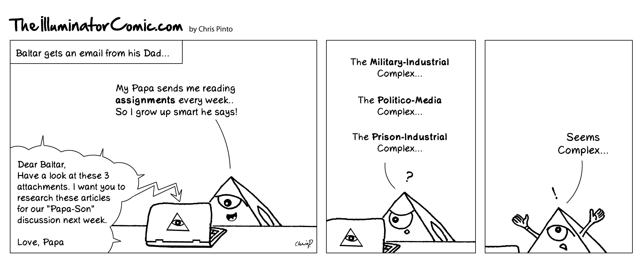 Illuminati, The Illuminator Comic, Triangle-head, Conspiracy theory, New World Order, NWO, Military Industrial complex, militaryindustrialcomplex, Politico Media Complex, Politicomediacomplex, Prison Industrial complex, PrisonIndustrialComplex, Baltar