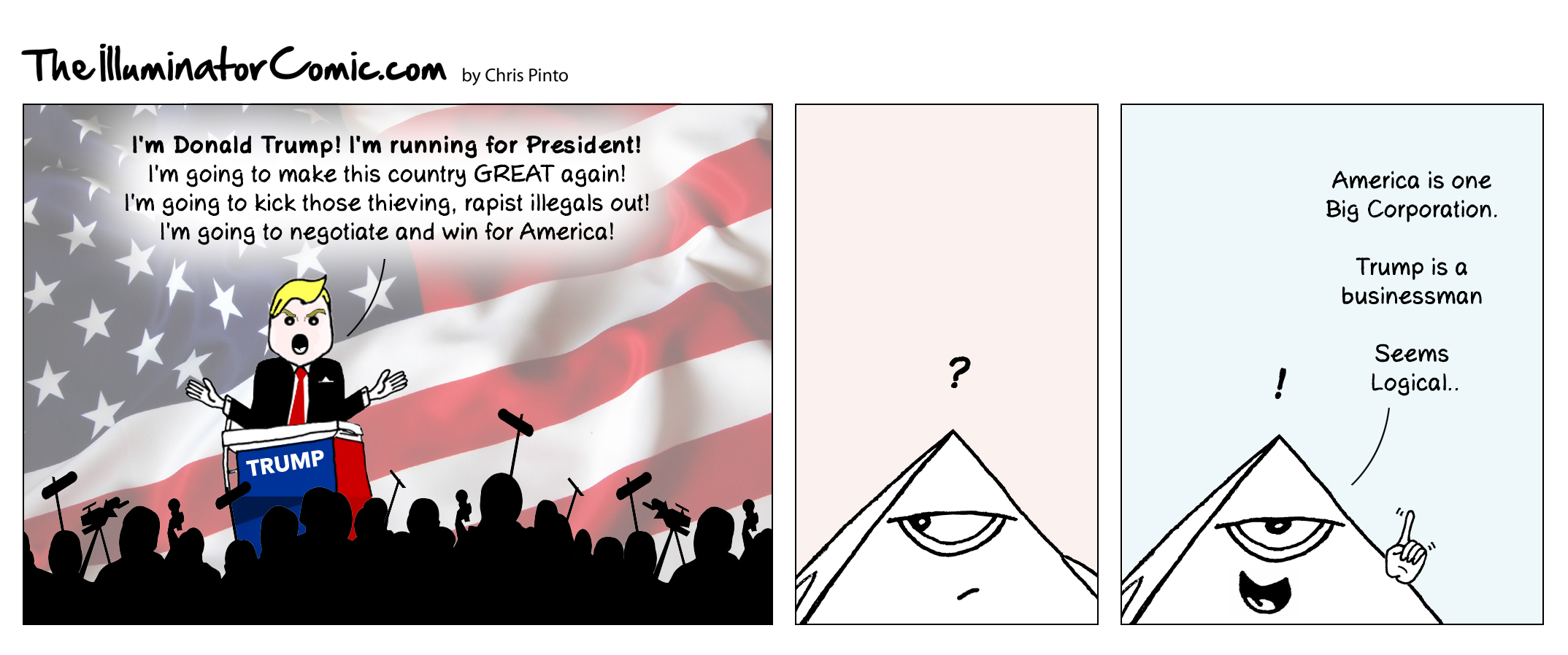 Illuminati, The Illuminator Comic, Triangle-head, Conspiracy theory, New World Order, NWO, President Trumpet, Trump