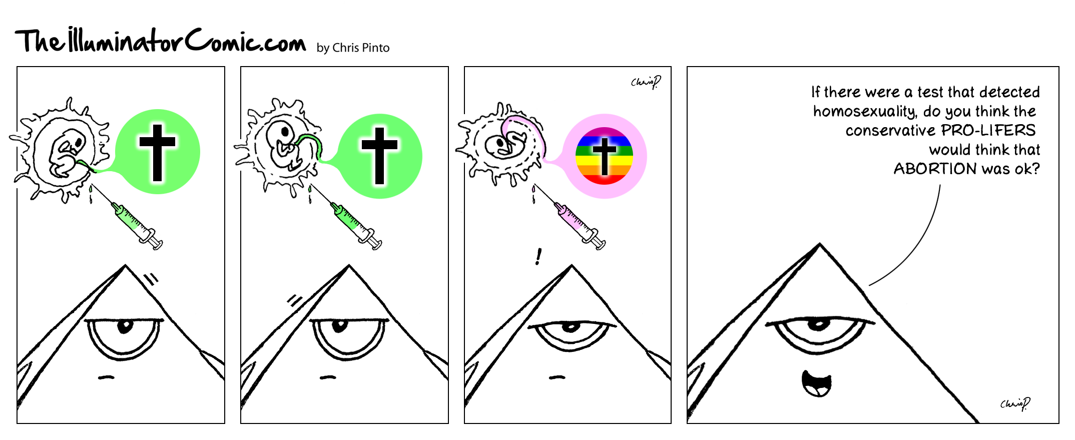Illuminati, The Illuminator Comic, Triangle-head, Conspiracy theory, New World Order, NWO, Abortion, rowevswade, prolife, pro life, Gay, Lesbian, LGBTQ, God, Atheist, atheism