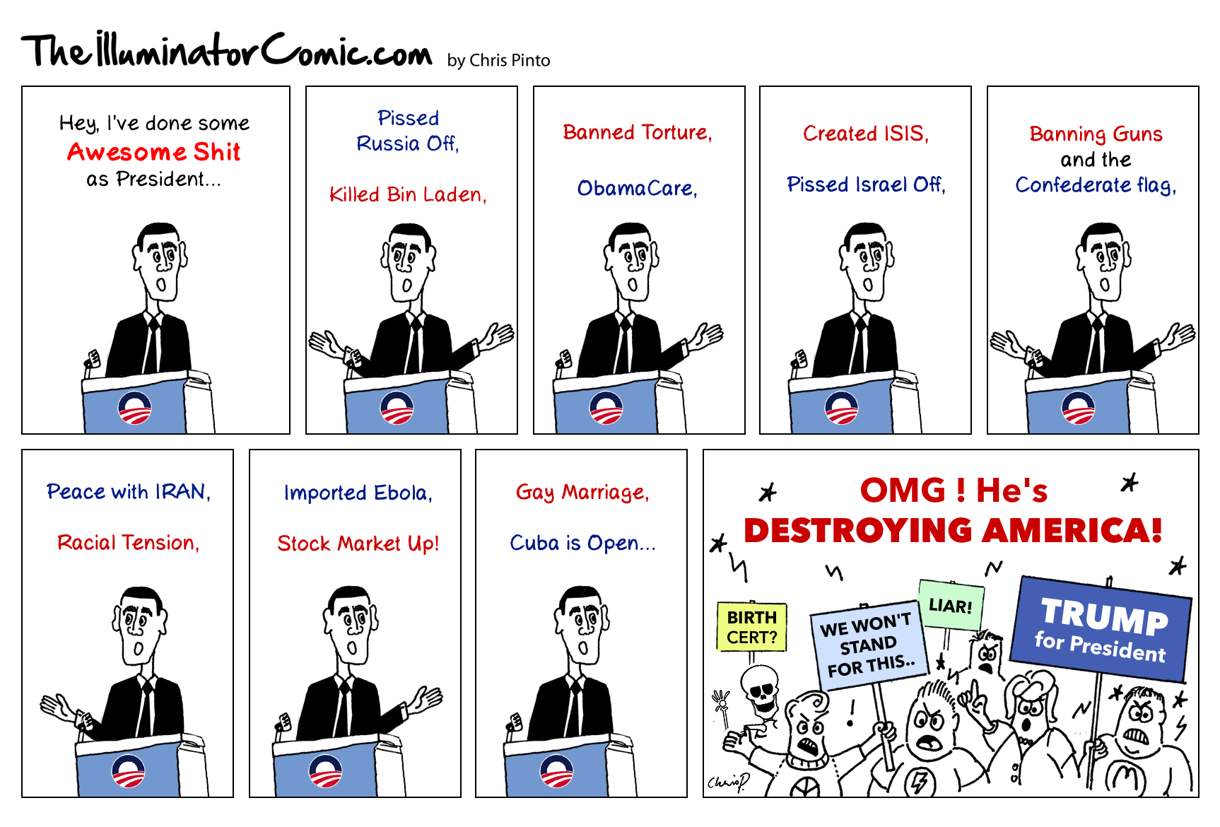 Illuminati, The Illuminator Comic, Triangle-head, Conspiracy theory, New World Order, NWO, Obama, Cuba, Ebola, Iran, Obamacare, Bin Laden gun control, 2a, Terror, Terrorist, Terrorism, ISIS, Islamophobia, Islam, President Obama, Racist, Racism, immigrant, msm, media lies, fake news