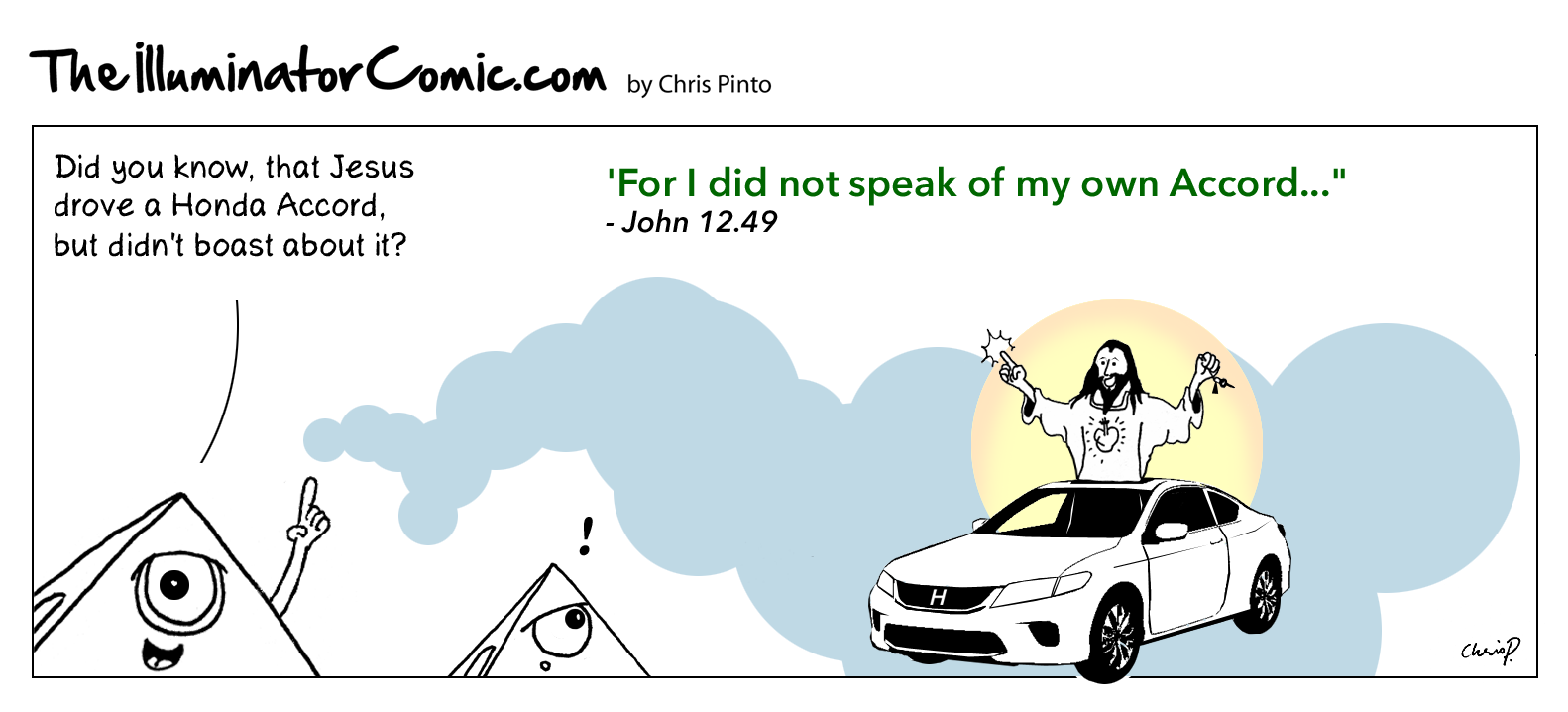 Illuminati, The Illuminator Comic, Triangle-head, Conspiracy theory, New World Order, NWO, God, Jesus, Honda Accord, John 12.49, Atheism, Atheist