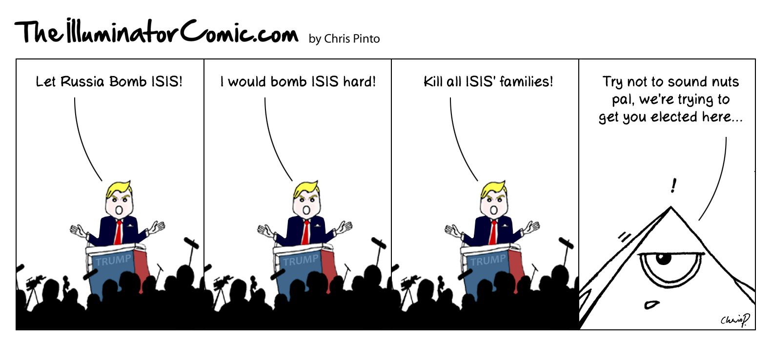 Illuminati, The Illuminator Comic, Triangle-head, Conspiracy theory, New World Order, NWO, Terror, Terrorist, Terrorism, ISIS, Islamophobia, Islam, President Trumpet, Trump