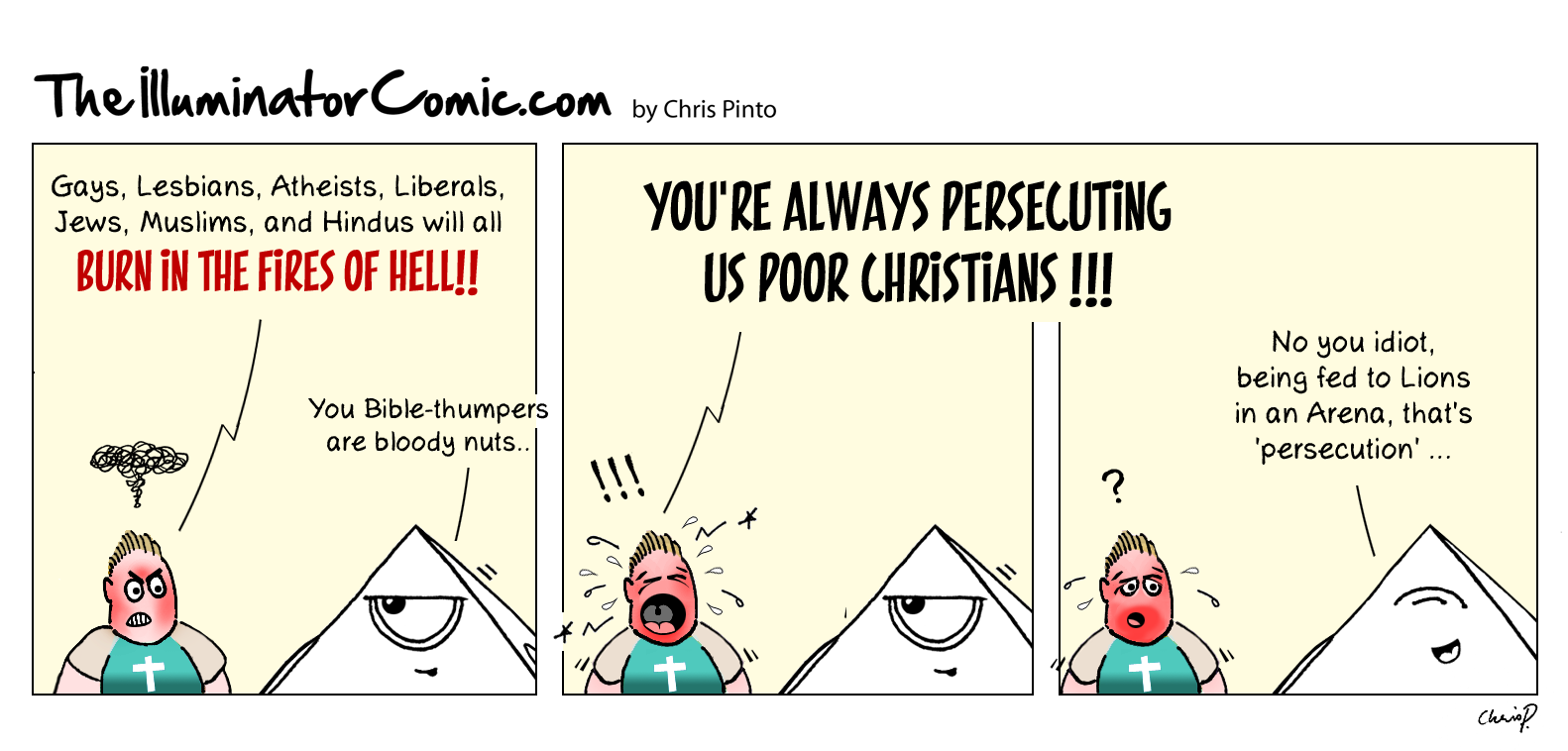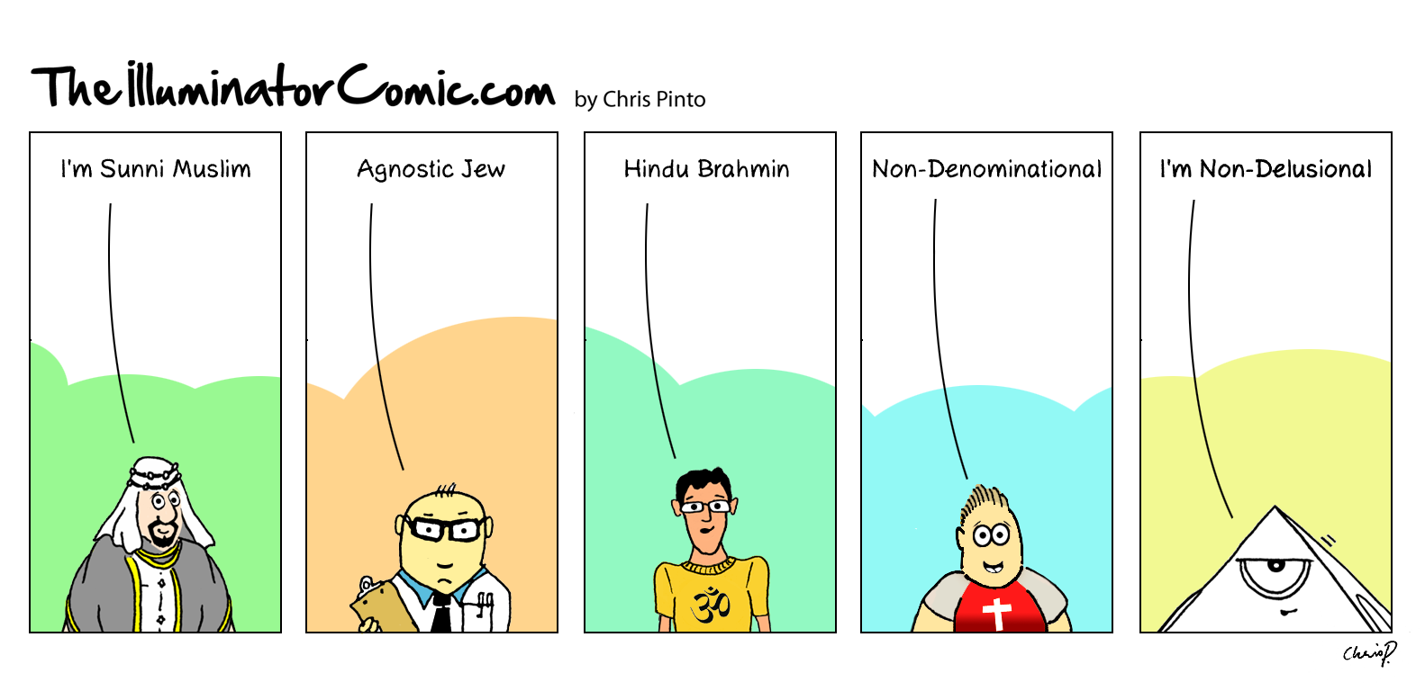Illuminati, The Illuminator Comic, Triangle-head, Conspiracy theory, New World Order, NWO, Believer Bob, Heaven, Hell, Gays, Atheist, Liberals, Jews, Christians, Hindus, Mulsims, Islam, God