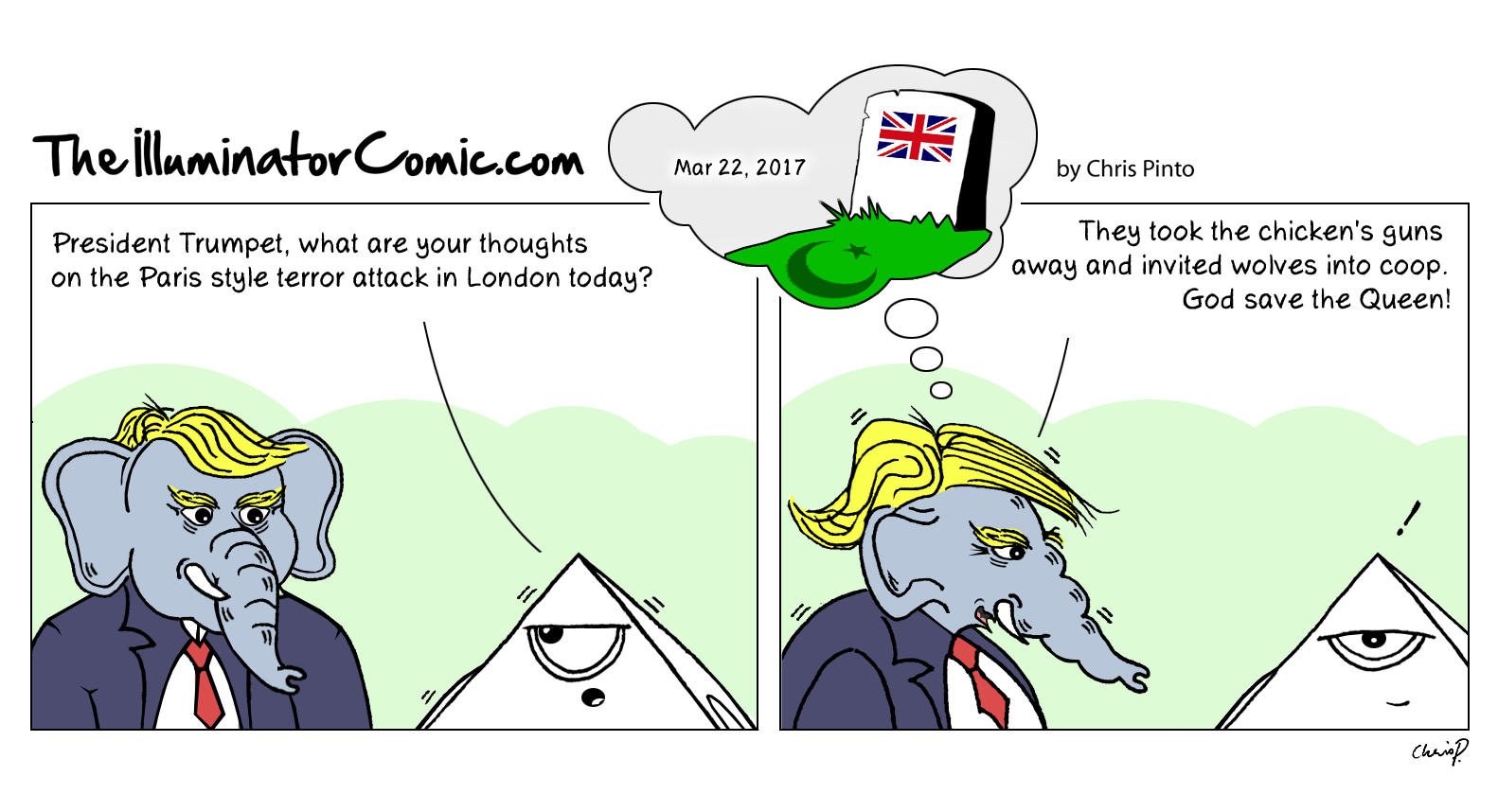 Illuminati, The Illuminator Comic, Triangle-head, Conspiracy theory, New World Order, NWO, President Trumpet, Trump, London, UK, Terror