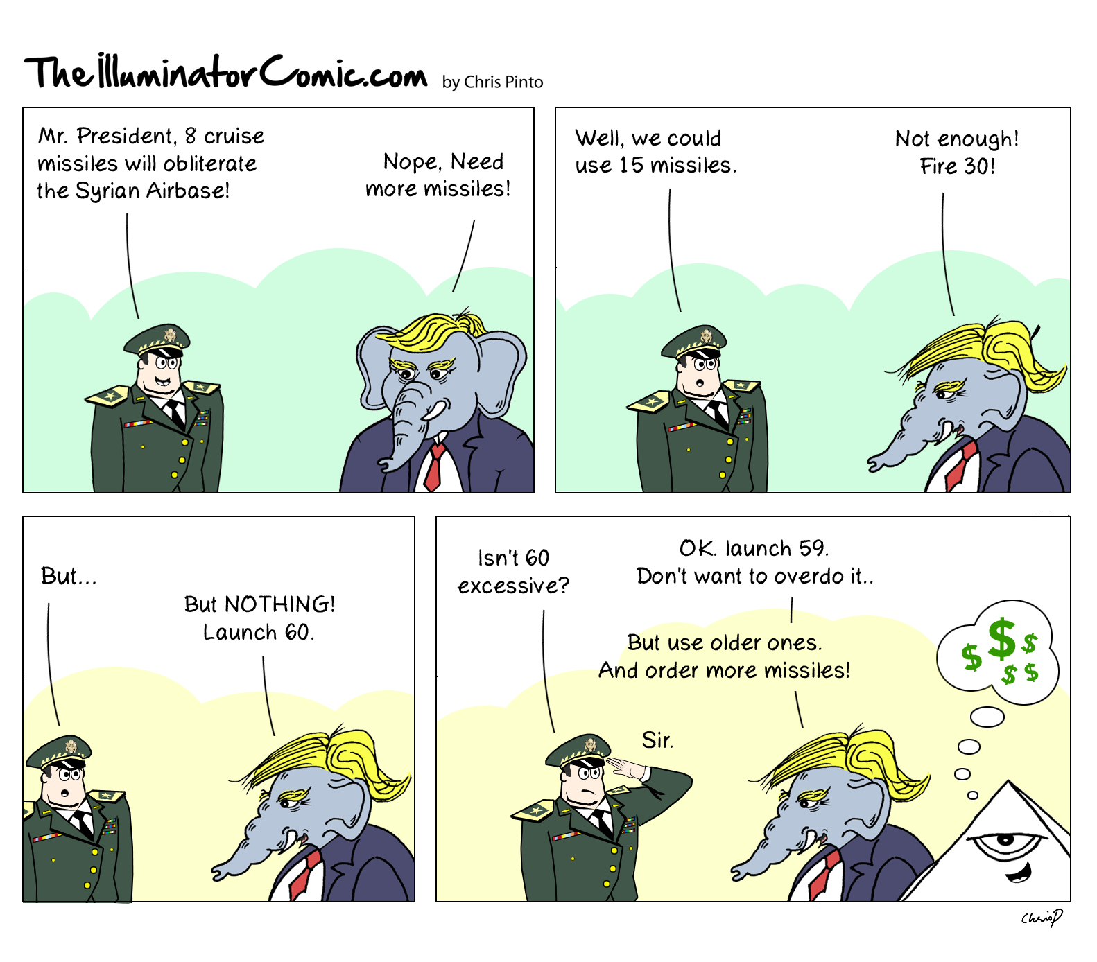 Illuminati, The Illuminator Comic, Triangle-head, Conspiracy theory, New World Order, NWO, Trump, president Trumpet, missiles, military, terrorism, Syria, Bashir, media, military industrial complex