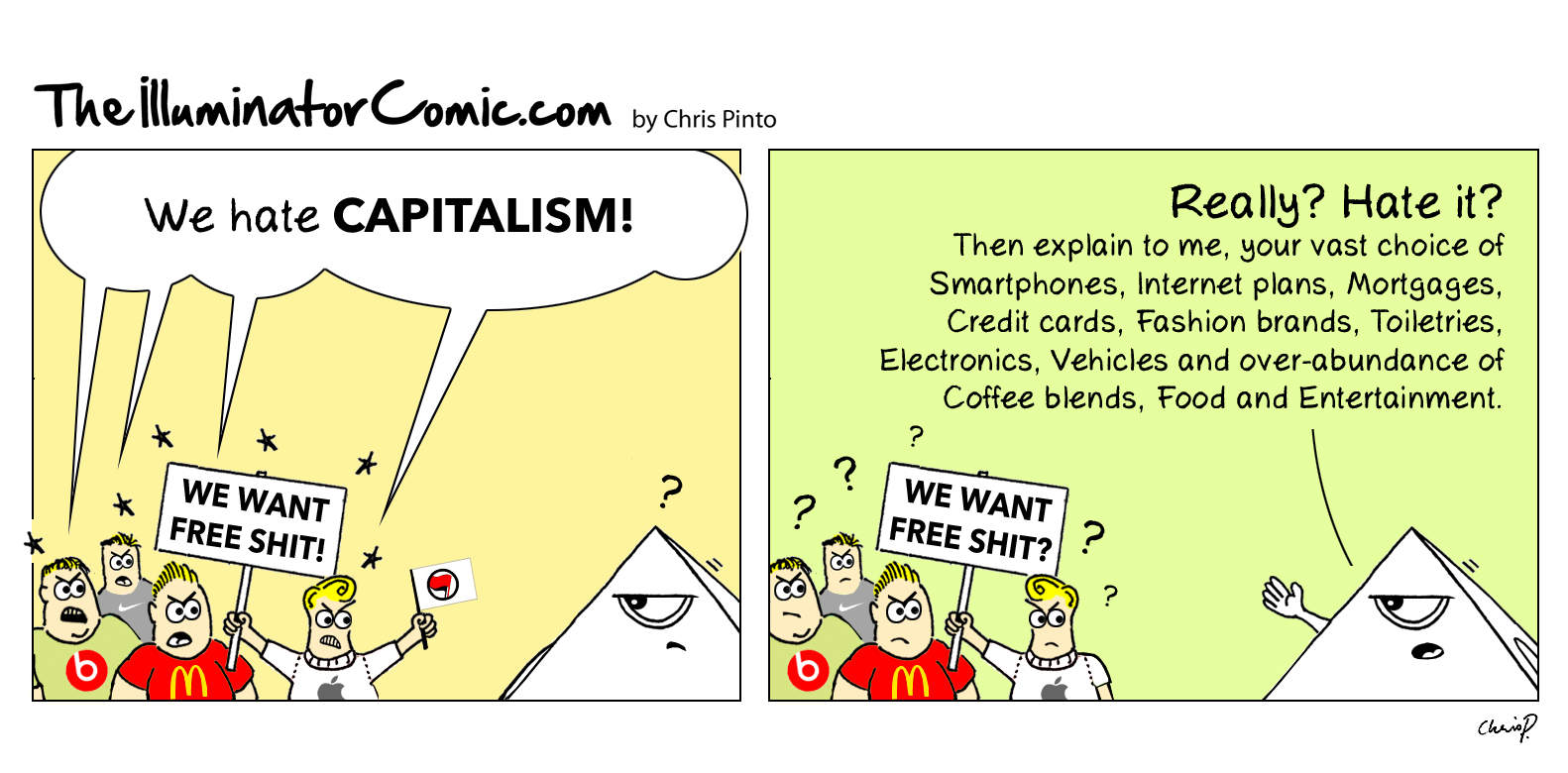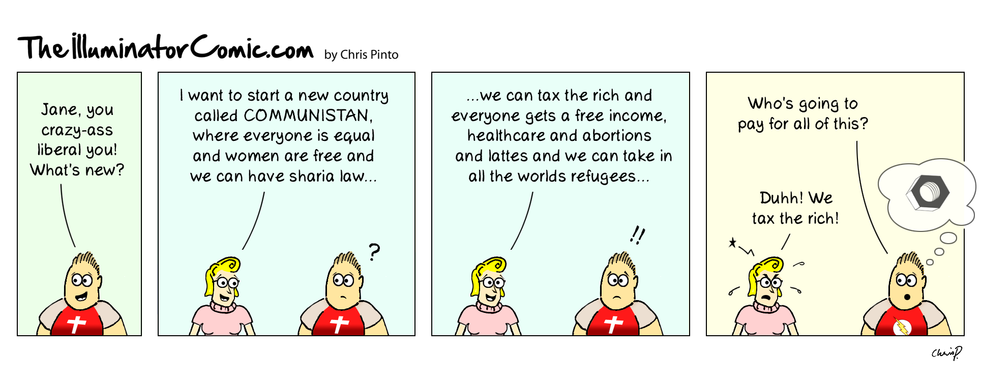 Illuminati, The Illuminator Comic, Triangle-head, Conspiracy theory, New World Order, NWO, Liberal jane, Believer bob, socialist, communist, liberals, democraitc socialism, abortions, healthcare, taxes