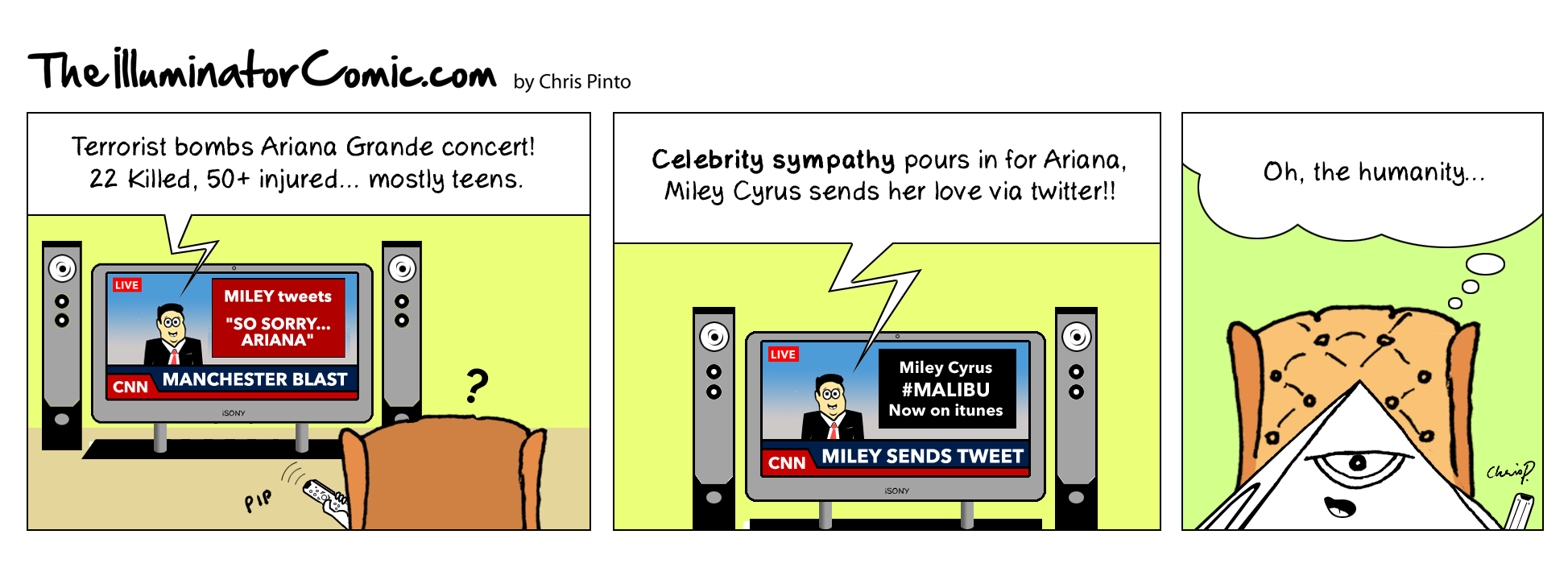 Illuminati, The Illuminator Comic, Triangle-head, Conspiracy theory, New World Order, NWO, Terrorism, terrorist, Ariana grande, Miley cyrus, cnn, msm, media lies, fake news, bomb