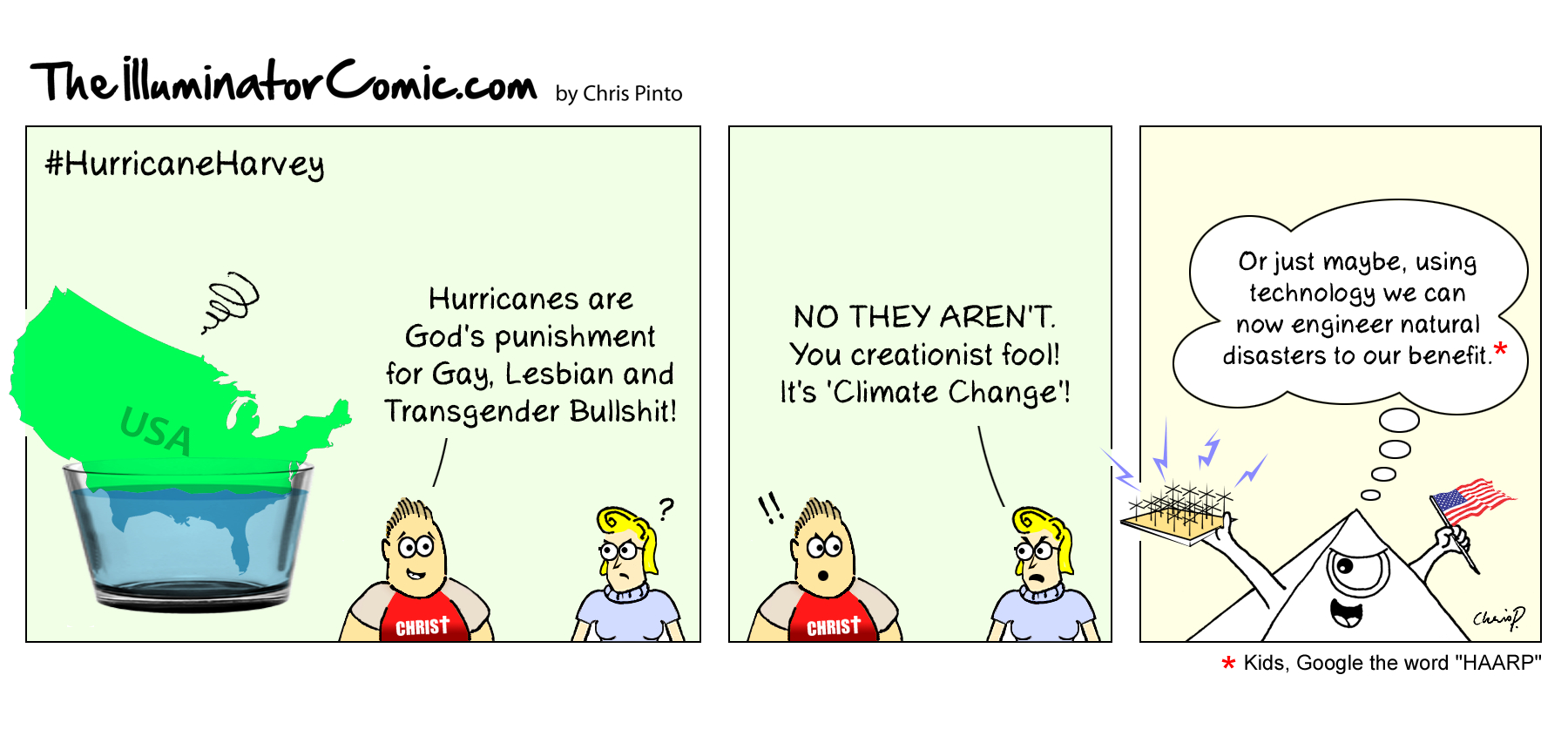 Illuminati, The Illuminator Comic, Triangle-head, Conspiracy theory, New World Order, NWO, Liberal Jane, Believer Bob, HAARP, Climate Change, Hurricane, Gay, Lesbian, LGBTQ,