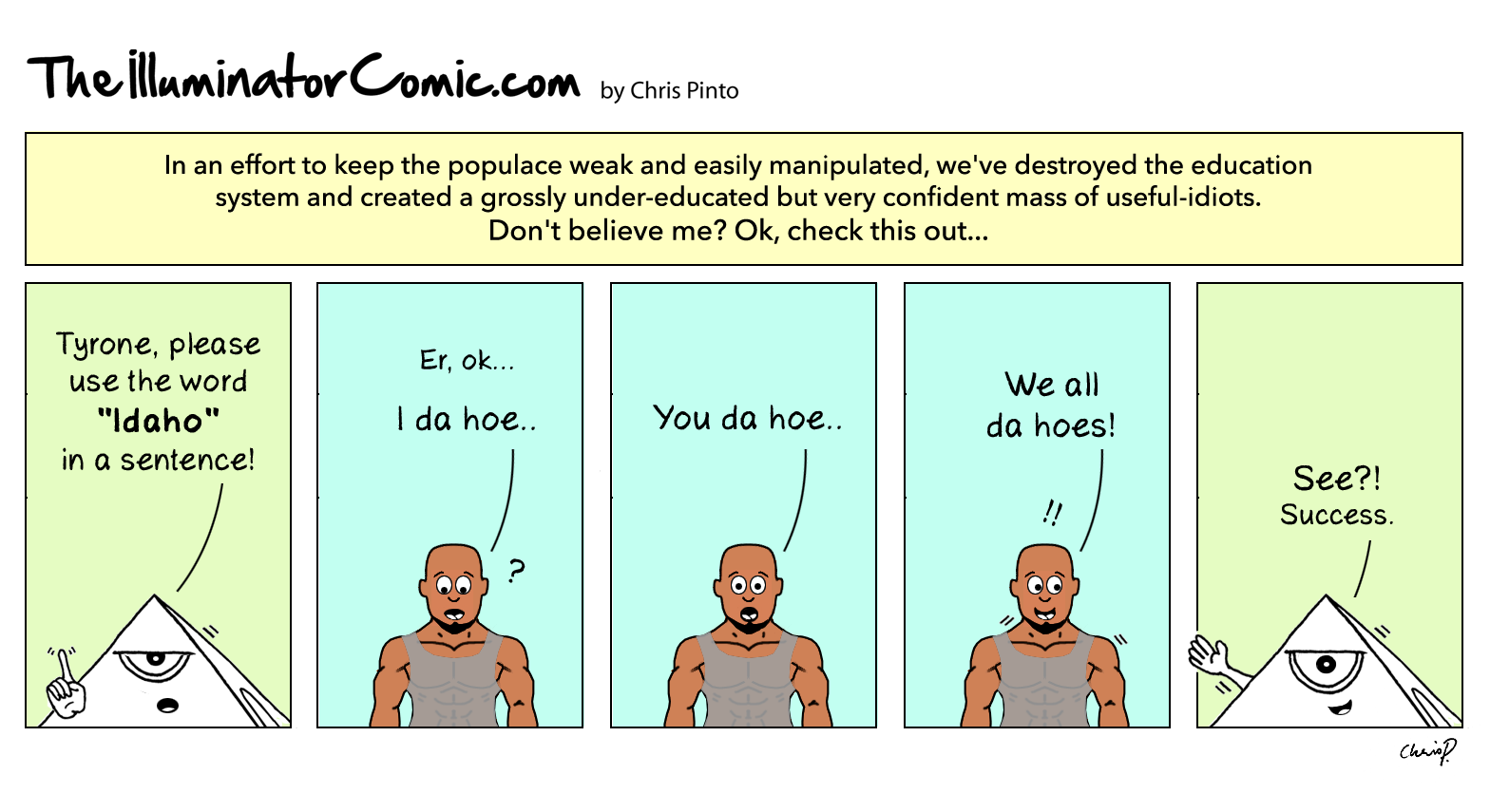 Illuminati, The Illuminator Comic, Triangle-head, Conspiracy theory, New World Order, NWO, idaho, Tyrone, useful idiots, education, media, manipulation, fake news